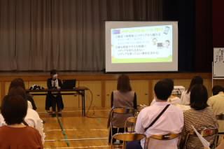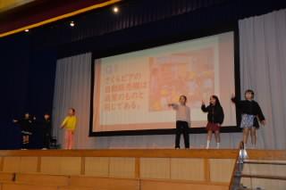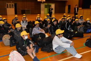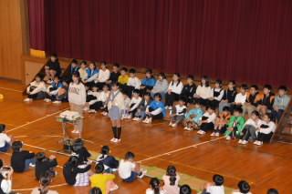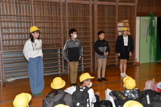 子どもたちは、教室に不審者が入ってこないようにバリケードを作り、静かに待ちました。不審者が確保された放送の後.、全員体育館に入り、市役所の生活安全課の職員の方から不審者から身を守る方法を教えていただきました。