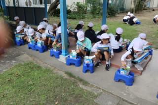 今日は全校で『大玉ころりん』(大玉転がし)の練習を初めて行いました。縦わり班で赤・白に分かれて競技をします。今日は風が強かったため、大玉を転がすにも一苦労していました。1回目の練習では、1回戦目は赤組勝利、2回戦目は白組勝利となり、3回戦目が行われました。3回戦目の結果は・・・白組勝利!今回は2対1で白組が勝ちました。果たして当日はどちらが勝つのか!?