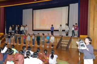 4月28日(月)のくすのきタイムの時間に、今年度初めての歌声集会を行いました。今回は『校歌』と『きみの心に』の2曲を歌いました。『校歌』は、まず2・4・5年グループと1・3・6年グループに分かれて歌い、それぞれのグループ斉唱後には感想を言い合いました。「大きな声でそろっていてよかった」などの感想が述べられていました。その後は全校児童で『校歌』『きみの心に』を歌いました。歌声の響く、明るい雰囲気の旭小学校を感じ取ることができました。