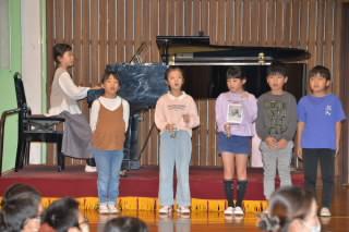 最初に、5年生の児童の伴奏で「うれしいひなまつり」を歌いました。
