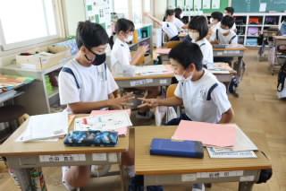 3年生は、図工で「トントンくぎ打ち コロコロビー玉」を製作中です。板に下絵を描き、絵の具で色を塗ります。今日は、板の外側に木の枠を接着剤でつけました。この後、くぎを打ったら完成です。早く完成して、ビー玉で遊べるのをみんな楽しみにしています。