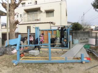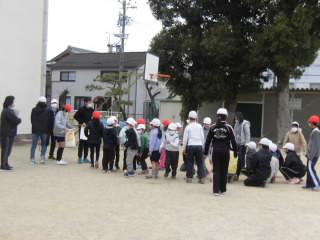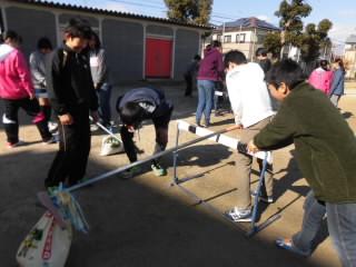1年生は、運動場で「大きなシャボン玉づくり」をしていました。先回の「これなーんだ」の答えの一つが大きなシャボン玉をつくる道具でした。