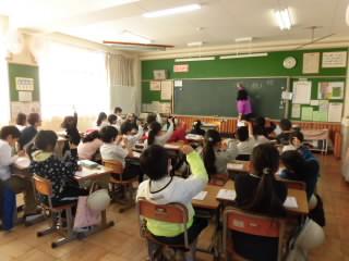 1年生です。テーマは、「なつといえば」で、海、プール、かきごおり、アイス、夏祭り…。元気に発言が続きます。最後になって、「藤田先生の意見を聞きたい」と、声が上がり、藤田先生が「流しそうめん」と、答えると、「あー、そうだね。それもあるね」と、納得していました。