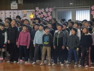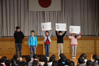 今朝は、土曜日に行われる市内小学校バスケットボール大会の選手激励会がありました。キャプテンの言葉があり、模範プレーそして、5年生の応援団による力いっぱいの応援が会を盛り上げてくれました。