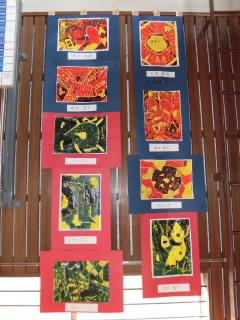6年生の図工の作品です。有名な絵画を模写しながらも自分のアイディアを盛り込んだ力作です。