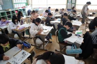 4年い組では、書写の授業で今年度最後の習字を書きました。