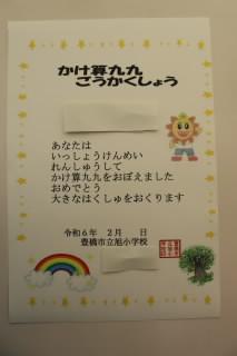 二つ目の作品は、己書です。2月23日に校区のお寺で行われた会で、己書の体験会をしていました。それに参加した児童の作品です。筆ペンを使って描きました。とても素敵な「ありがとう」の作品が出来上がりました。