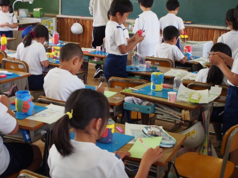 3年生の図工の時間です。今日は、「ハッピー小もの入れを作ろう」をテーマに赤・黄・青・白の4色の粘土でペットボトルの周りを飾りつけをし、かわいい小物入れを作っていました。中には、2色を混ぜて緑色にし、昆虫を作るなど、模様の工夫だけでなく、色づくりの工夫をし、一人一人がアイデアいっぱいの作品となりました