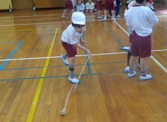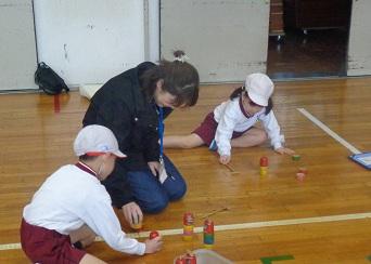 芦原小学校の子どもたちは「くつ飛ばし」ゲームを考え、ルール説明をして見本を見せたり、各グループの進行をしたりしてみんなが楽しめるように頑張っていました。