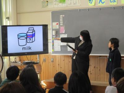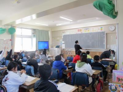 <3年生:英語ではクイズ大会!班ごとで点数を競っています。とても楽しそうに取り組んでいました>