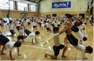 5・6年生は「精神一到~力を合わせて~」と題してスタンツを披露します。友だちと協力しながら練習に練習を重ねた結果、しだいに息の合った演技になってきました。当日は、一致団結して見せる技の数々をお楽しみください。【214】