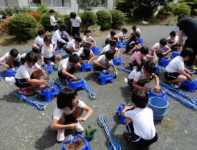 2年生が生活科の授業で夏野菜を植えました。自分で選んだ野菜を、自分のプランターに、自分の手で植えました。友だちと一緒に、苗や土の手触りや匂いを充分に感じながら植えていました。【220】