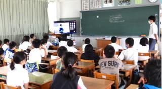 6年生の英語の授業の様子です。自分のおすすめの国を英語で紹介しています。子どもたちは、スピーチの内容に合わせて、タブレット内の写真を大画面TVに表示しながら伝わりやすい工夫をしていました。【599】