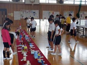 9月6~7日、体育館で夏休み作品展を開催しています。子どもたちが取り組んだアイデア貯金箱、工作、自由研究、壁新聞などを展示していて、力作ぞろいです。他の子の作品を眺めて、感心している子もいました。多くの保護者の皆様にも足を運んでいただき、ありがとうございます。【984】
