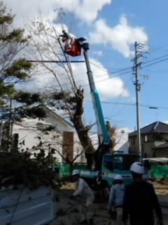 青陵中学校区の小中学校の用務員が集まり、下条小学校、旭小学校、東田小学校で高い木の枝を切り落とす作業をしました。高所作業車を使ってのこのような作業は、年に数回、必要に応じて行われています。子どもたちの安全のために様々な職員が組織的に働いています。【97】