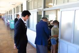 先週、豊橋市の市長や教育長、課長が来校されました。感染対策を含めた新学期の学校の取り組みについて、校長室で説明を聞いたり、教室へ足を運んで見学したりされました。(写真手前右が市長です)【612】