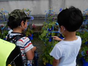 1年生が毎朝水やりをして大切に育てているアサガオが色とりどりの花を咲かせています。「校長先生見て~!」と嬉しそうに私を誘ってくれる子もいます。友だちと見せ合いっこしながら、お互いの花やつぼみを数えて自慢しあう微笑ましい姿があちらこちらで見られます。【370】