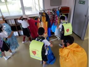 今日は大雨の中での登校でした。1年生はカッパを着て登校する姿が目立ちます。うがいと手洗いをすませたら、自分のカッパを自分でたたみ、自分のハンガーにきちんとかけます。【373】