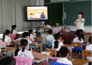 3年生の代表が1年生の教室へ出向き、プレゼントを渡していました。これは、今まで体育館に全校児童が集合して行っていた「1年生をむかえる会」の代替活動です。3年生のメッセージは寄せ書きでした。登下校の時に注意するとよいことが自分たちの言葉で綴られています。【374】