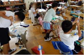 4年生が、閉じ込められた水に力を加えた時の体積変化を調べてました。「変わらない」や「小さくなる」という自分の予想が正しいことを確かめたい子どもたちは、自分の水でっぽうと格闘しながら、思い思いの姿勢で力いっぱいに押していました。【377】