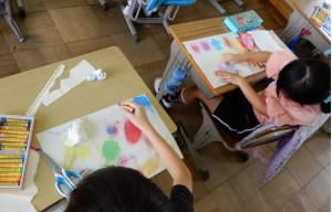 先週見かけた2年生の図工の授業です。クレヨンで描いたものを手や紙でこすっていました。形や線がやわらかくなったり色が混ざったりする変化を楽しんでいました。どんなお話が生まれるのか楽しみです。【380】