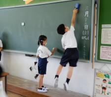 低学年の子どもが、黒板をきれいにしようとして思い切り何度もジャンプしていました。何度も挑戦した結果、白いチョークは跡形もなくなりました!がんばりましたね!【394】