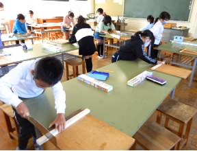 3年生が昇降口近くで理科の授業をしていました。各自が作った日時計を地面に置いて1時間ごとに影を記録したり、遮光版を使って太陽を観察したりしていました。【653】