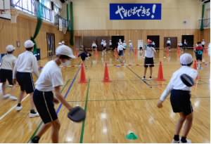 テニピンは、手の平にはめたスポンジやダンボールのラケットで、スポンジのボールを打ち合うゲームです。体育の授業で取り組んでいる5年生が、とても楽しそうにペアで試合をしていました。【645】