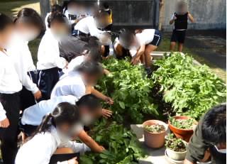 2年生の生活科の授業の様子です。菜園で育てているダイコンの間引きをしています。引っこ抜いた小さくてかわいいダイコンを大切そうに観察したりタブレットで撮影したりしていました。【654】