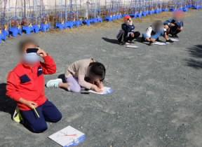 11月8日からマラソン大会に向けての練習「かけ足チャレンジ」を実施しています。密集を避けるために、青空タイム中に2学年ずつ走っています。プレハブ校舎で狭くなった運動場ですが、子どもたちは力一杯に走っています。【655】