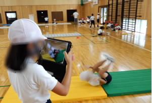 3年生の体育の様子です。マット運動の技を、ペアで撮影し合っていました。撮影した動画は、本人が何度も見返したり、静止させて体の動きをじっくり確認したりしていました。デジタル機器の良さを生かした使い方に感心しました。【592】