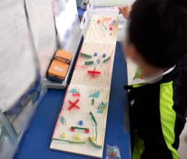 1月25日のブログで紹介した3年生の図工作品(ビー玉をころがして遊ぶおもちゃ)は、友だちのものと連結することができます。放課に通りかかった教室では、3つの作品をつないで友だちとビー玉をころがして楽しそうに遊ぶ姿を見かけました。【900】