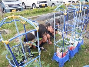 2年生が生活科の学習で野菜を育てています。キュウリ、ピーマン、ミニトマト、オクラ、自分で選んだ野菜に、毎朝登校後に水やりをしています。「小さなトマトができたよ」「赤ちゃんピーマンができたよ」など、うれしそうに教えてくれました。【955】