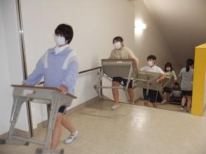 第3期改修工事が予定通りに終わり、プレハブ校舎から1、3、5年生とおおぞら学級が新校舎へ引っ越しをしました。子どもたちは、机やいす、教室内の教具などを協力して運びました。1、3年生の机を6年生が手伝って運んでくれました。新校舎に初めて入った子どもたちは、とてもうれしそうでした。【956】