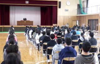 今週の月曜日に、同窓会入会式が開催されました。同窓会長からあいさつをいただいた後、代表の子どもが、記念品として、同窓会からのペーパーウエイトと、PTAからの卒業証書フォルダを受け取りました。【927】