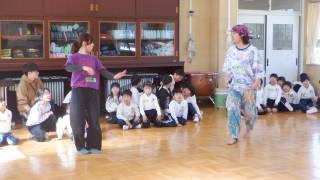 2月19日 プラットが企画するワークショップを前回学級閉鎖でできなかった1年2組が、行いました。前回のダンス講師とは違うかたがお見えになりました。まずは、名前など言葉にリズムをつけることから始め、前半は動きのまね、後半は、「くるくるまわる」をテーマに音楽に合わせて表現しました。転がったり、側転したり、友達どうし手をつなぎながら回ったりと、思い思いのダンスを披露していました。リズムにのりながら楽しそうに表現する姿に圧倒されました。