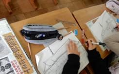 6年生が版画の下絵を描き始めました。図鑑や写真集を見ながら、日本の伝統的な造形物等を描いていました。写真をじっくりと見ながら、まず鉛筆で下絵を描き、その線を丁寧にペンでなぞっていました。【324】