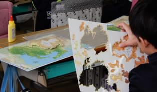 先週見かけた4年生の社会科の授業の様子です。1つ1つのパーツを切り取って、土台の地図に正確に貼る作業に集中していました。完成すると立体的な愛知県の地形図ができあがります。それを使って愛知県の特徴などを学んでゆきます。【326】