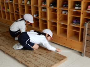 また一つ子どもの素敵な姿に出会いました。掃除の時間の1年生です。自分たちが毎日使う場所への愛情が感じられる真剣な掃除態度です。私のカメラにも気づかないほど集中して、友だちとも協力しながら黙々と取り組んでいました。【330】