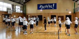 昨日の体育館での5年生の体育の授業の様子です。楽しくたくさん体を動かす授業づくりの工夫の一つとして風船を使っていました。子どもたちは班で協力しながら、風船を使う運動にとても楽しく取り組んでいました。【327】