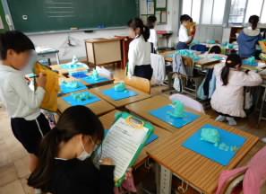2年生の図工の授業で、鑑賞会をしている場面を見かけました。粘土で作った自分の作品を全員が机に置き、教室中を歩いて友だちの作品を鑑賞しました。そして、特に気に入った作品について、その良い点を自分の言葉で文章にしました。全員がとても集中していました。【328】