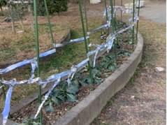 おおぞら学級の子どもたちが大切に育てているキャベツが、どうやらカラスに食べられたようでした。そこで子どもたちと教員が協力してカラスよけを設置しました。これで大丈夫な事を願います。【703】
