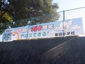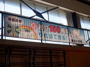 児童からデザインを募集して作製した創立150周年記念事業の横断幕が完成しました。横断幕は、学校敷地西側の青陵街道沿いのフェンスと体育館のギャラリーに設置してあります。ぜひ、ご覧ください。【1023】