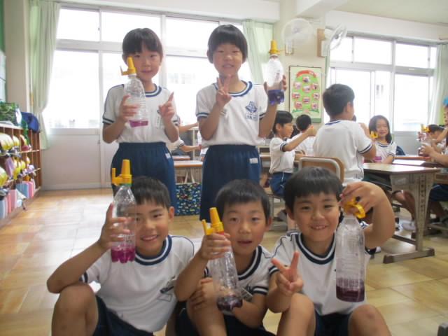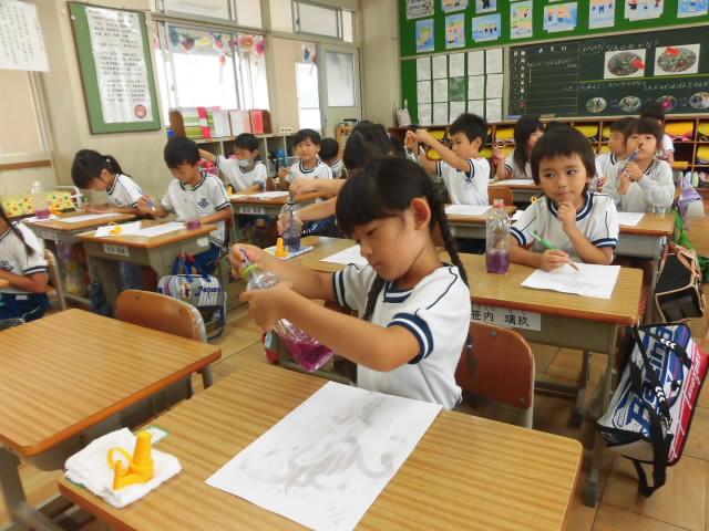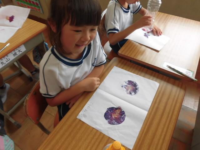 1年生が大切に育ててきたアサガオの花を使って、たたきぞめと色水で遊びました。