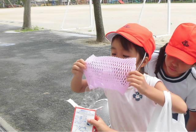 子どもたちは,形を変えたハンガーやトイレットペーパーの芯,うちわなどいろんな道具を持ってきました。どんなシャボン玉ができるかな?