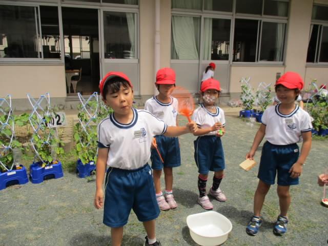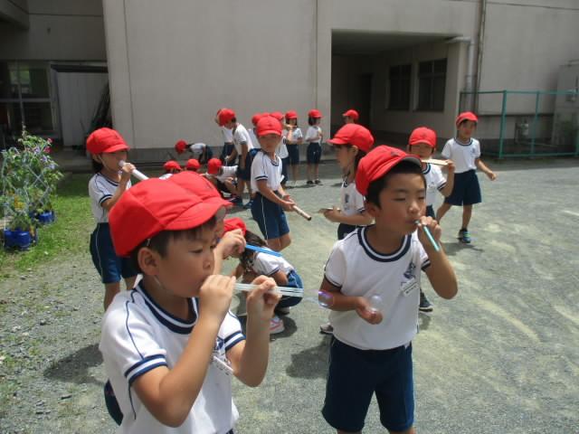 生活科の授業で,様々な道具を持ち寄ってシャボン玉で遊びました。