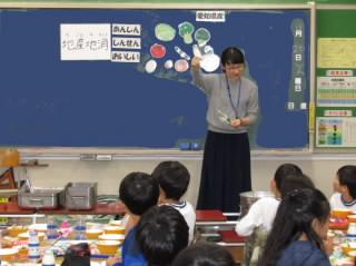 今日の給食の時間に,3年1組に栄養教諭が来校し,給食指導を行いました。給食は「地産地消」で愛知県産,豊橋市産の食材をできるだけ使って作られていることや,感謝しておいしく食べることなどを教えてもらいました。
