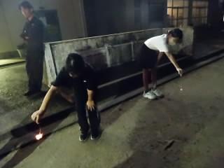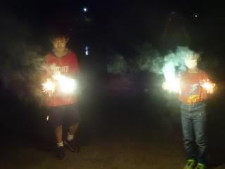 外が暗くなってきたら、いよいよキャンプファイヤーです。雨が降ってしまったので、室内で行いました。完成したマントをつけてダンスをしたり、ゲームをしたりして盛り上がりました。19時ごろには雨が上がったので、みんな外に出て花火をしました。今年も花火の時間は、みんな大興奮でした。