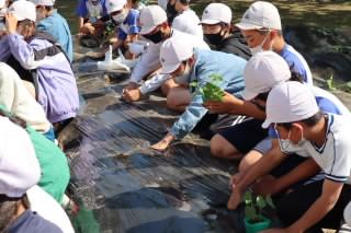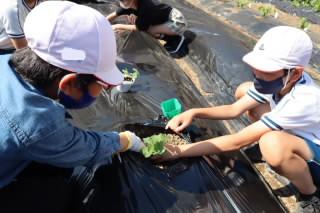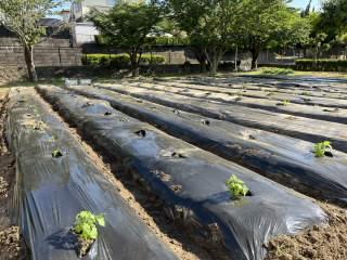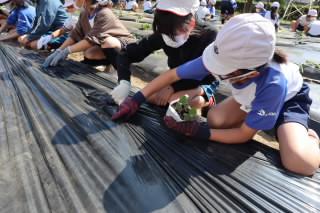 太陽がさんさんと輝く中で、協力して苗を植えました。