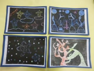 3年生は凸凹のある身近な材料を台紙にはって,「ふしぎな生き物」を表しました。